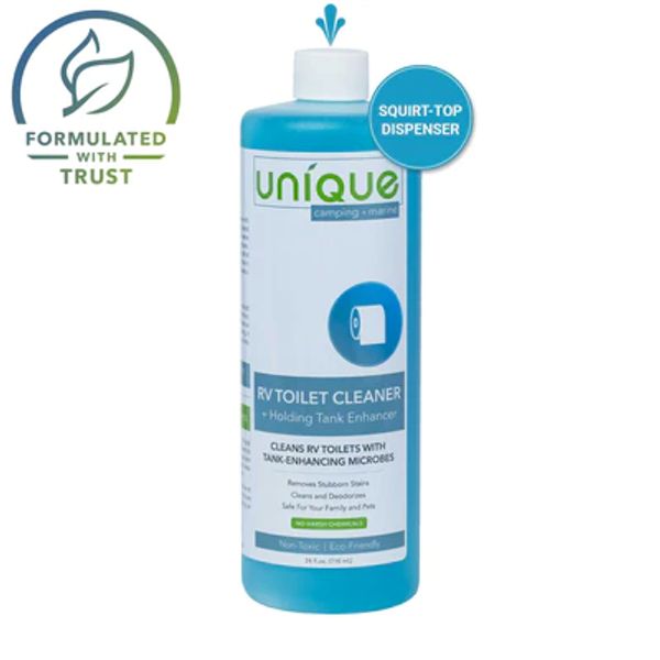 Unique RV Toilet Cleaner + Holding Tank Enhancer uses an advanced blend of bacteria and enzymes that contains no caustic chemicals like bleach to remove even the toughest toilet bowl stains while enhancing the bacterial breakdown inside your holding tank. So you can rest easy knowing your toilets are sparkling clean and your holding tank is safe from backups, clogs, or odors.